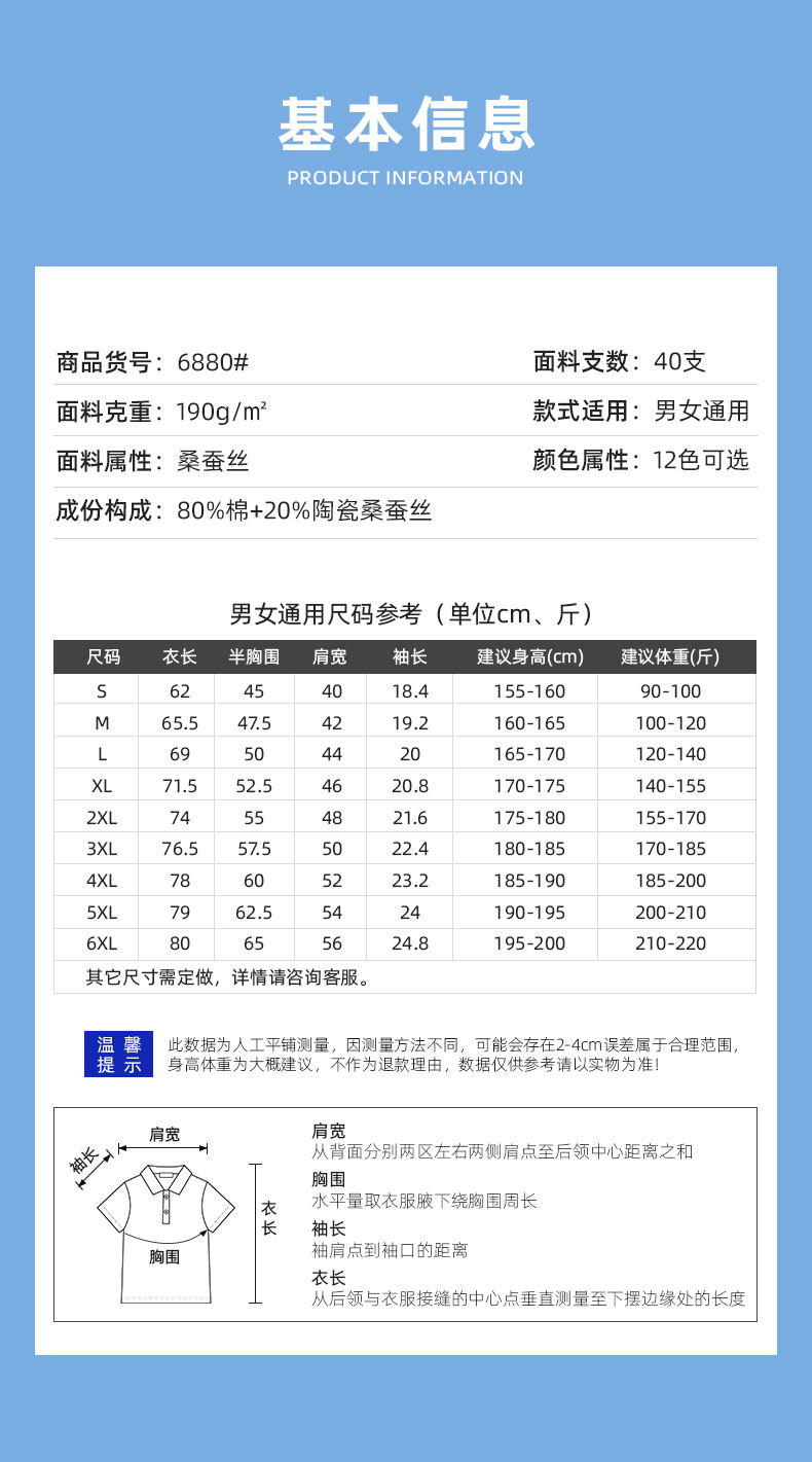 货号:6880 面料:40S 190G 80%棉20%陶瓷桑蚕丝