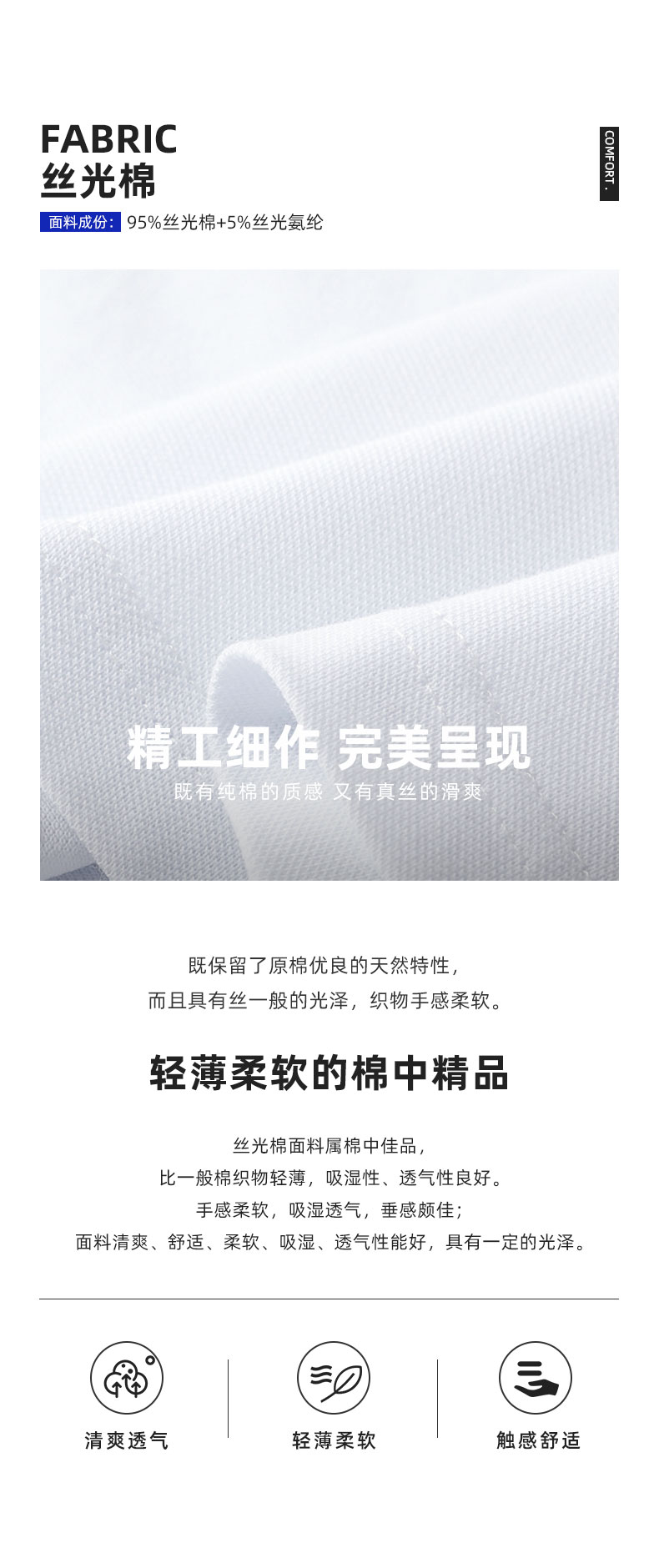 1. 布料:50S 190G双丝光棉 95%双丝光棉 5%丝光氨纶