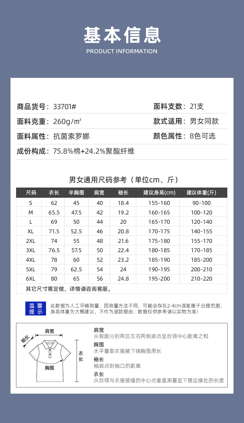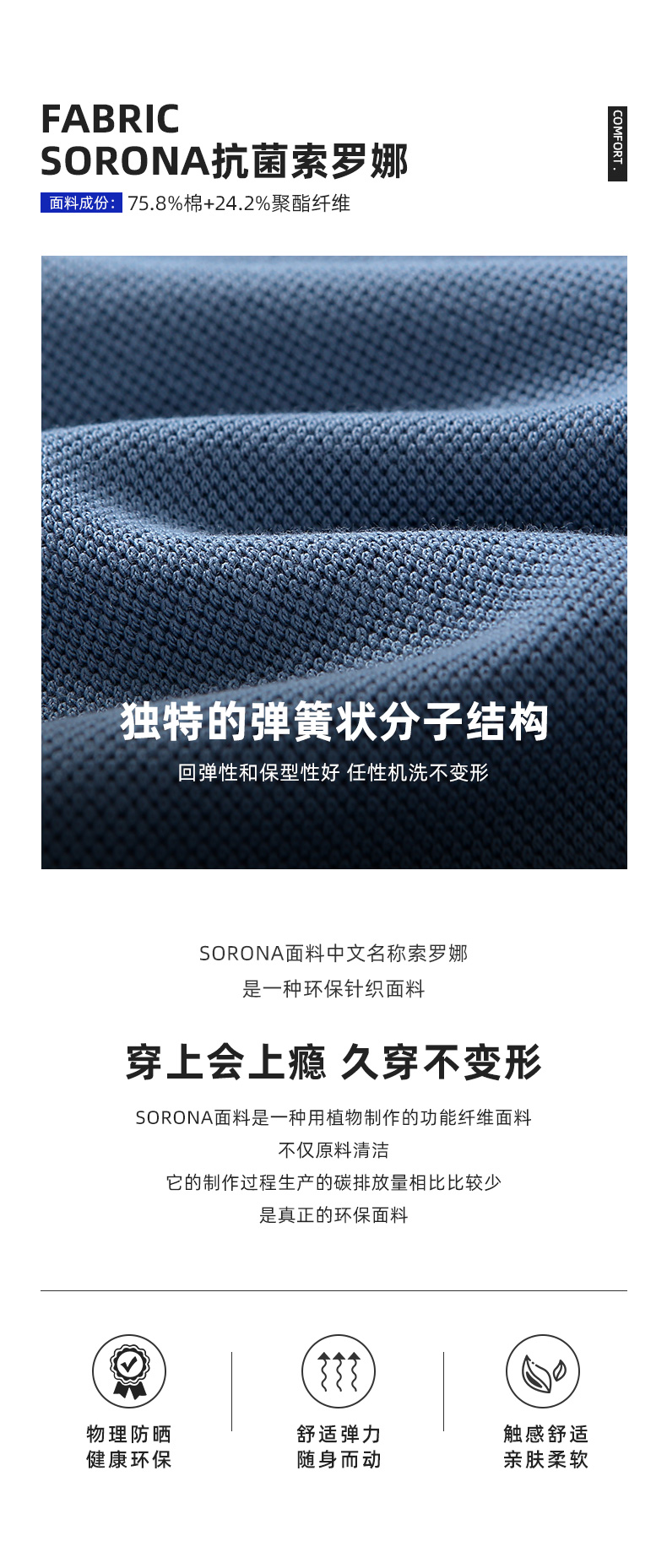 1. 布料:21S 260G 76%棉+24%聚酯纤维(索罗娜Sorona)